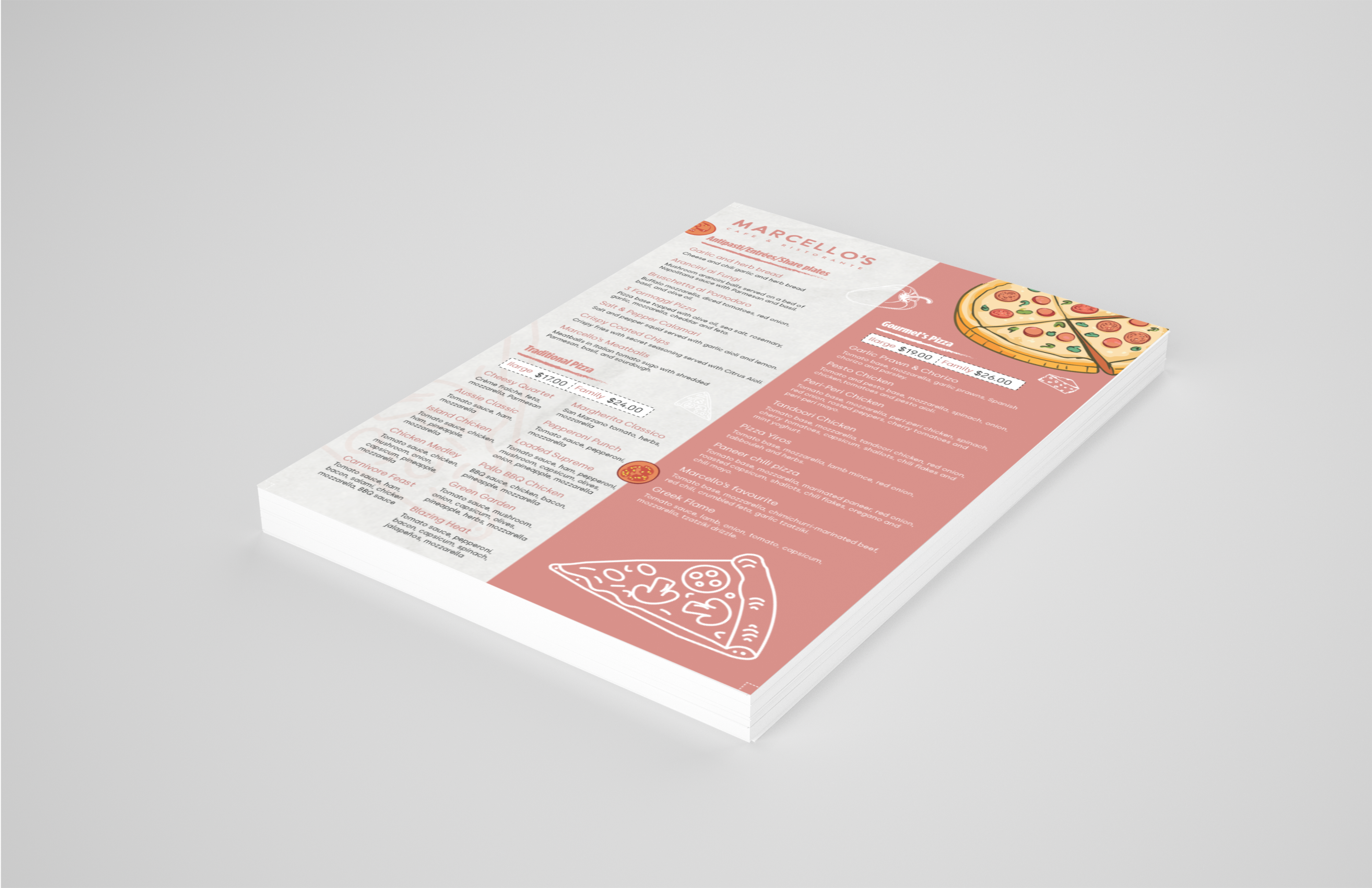 The Marcello’s Café & Ristorante menu design combines clarity with brand sophistication, using a warm color palette, clean typography, and subtle illustrations to create an inviting yet professional look. Structured layouts and highlighted pricing ensure easy navigation, while the overall design reinforces Marcello’s identity as a modern, authentic, and customer-focused dining brand.