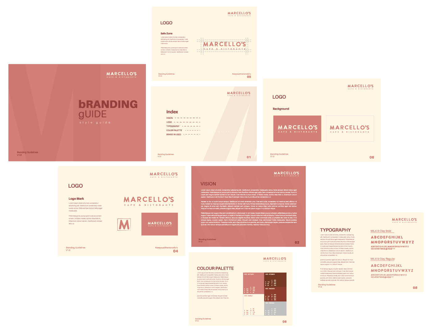 Marcello’s Café & Ristorante is built on the essence of authenticity, quality, and Italian hospitality, blending tradition with modern sophistication. Our branding reflects warmth and elegance, ensuring a consistent identity across every touchpoint. The logo is to be used with clarity and respect, supported by bold typography for headlines and clean, legible fonts for body text. A refined color palette of terracotta, deep brown, beige, and white symbolizes comfort, richness, and timeless style. Photography should capture authentic dining moments, vibrant dishes, and warm atmospheres, always with natural tones and minimal filters. From menus and packaging to digital platforms, our design approach remains simple, elegant, and true to our character. Every message is heartfelt, conversational, and infused with Italian flair, reinforcing our promise: Marcello’s is where authentic flavors meet modern dining.