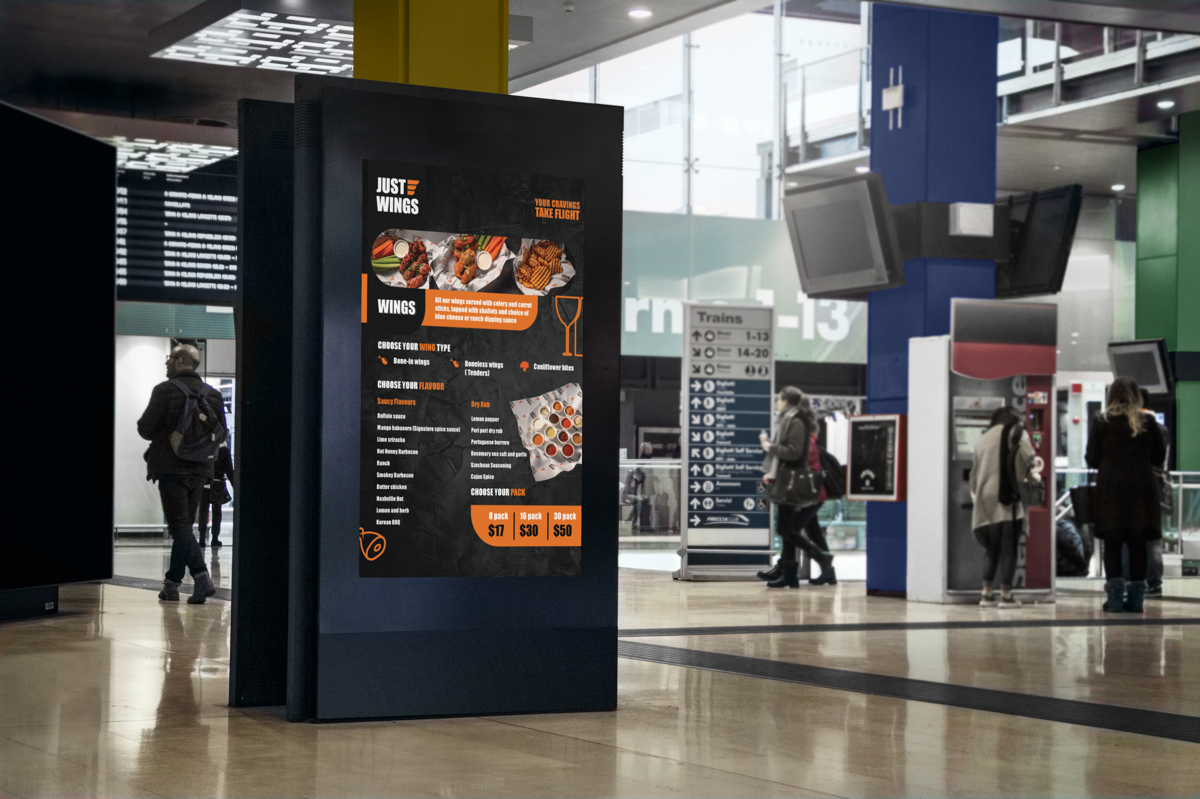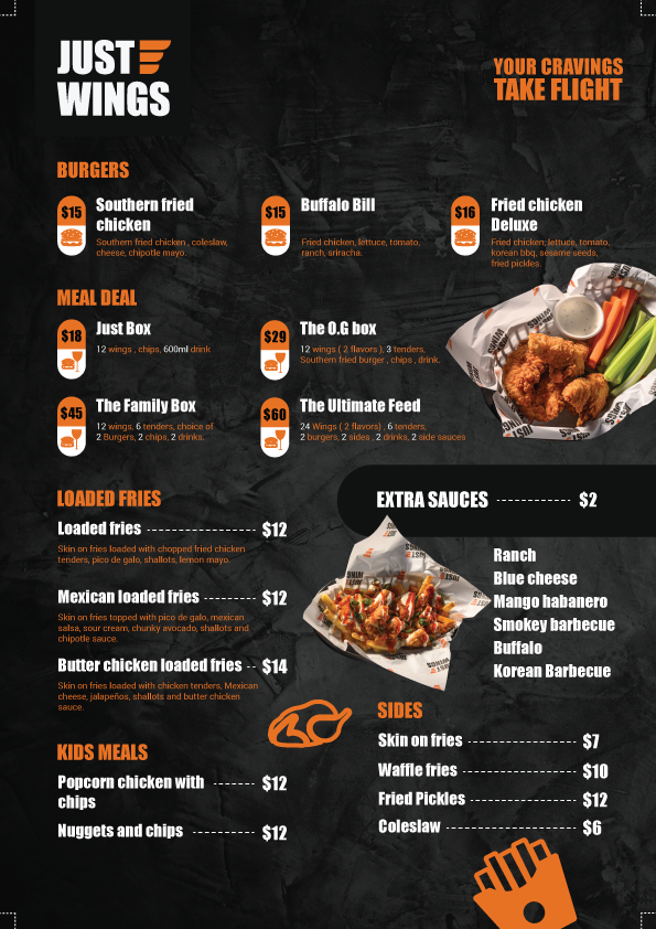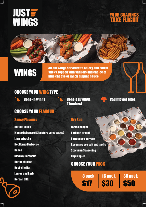 MA bold and engaging menu crafted for Just Wings, highlighting their wide range of saucy and dry rub flavors. The design balances vibrant food photography with strong typography and brand colors, ensuring easy readability and appetite appeal.